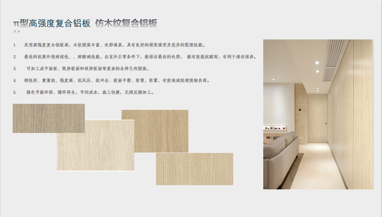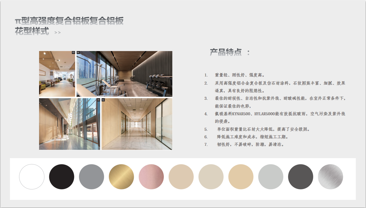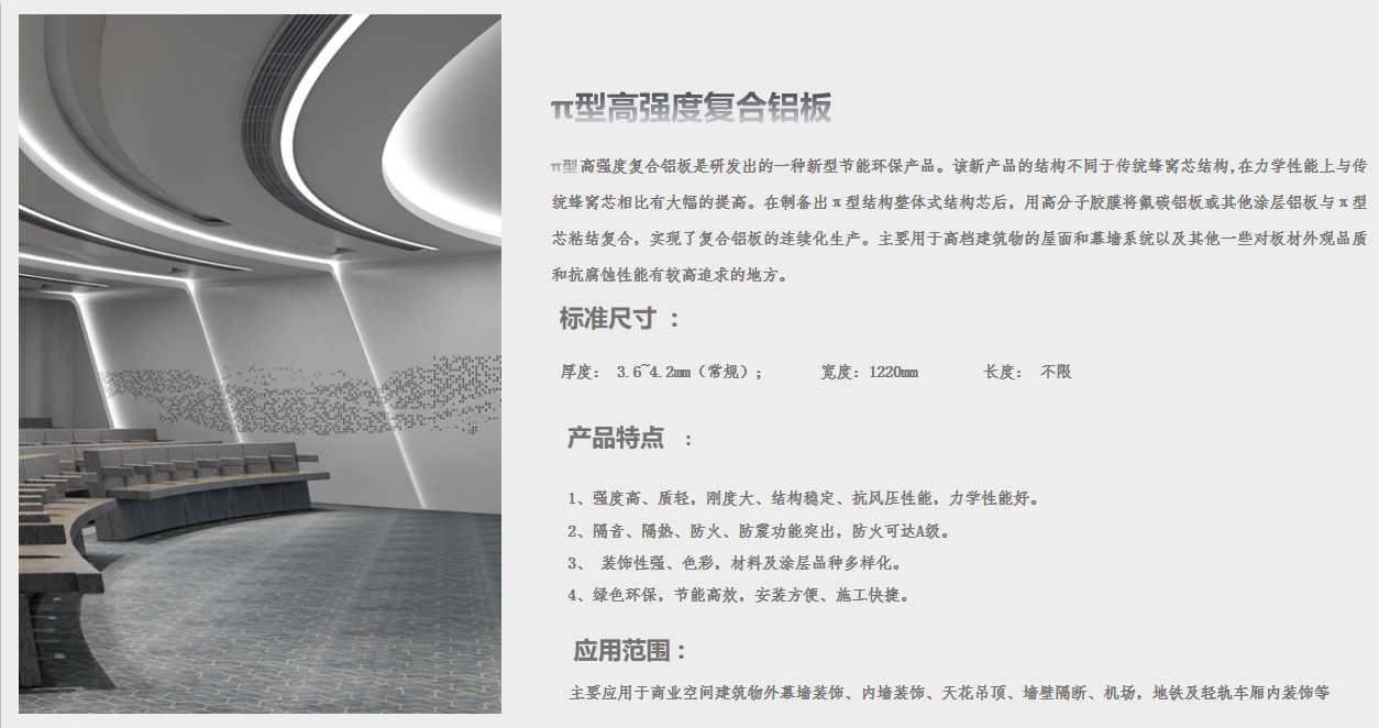 π型高強(qiáng)度復(fù)合鋁板是研發(fā)出的一種新型節(jié)能環(huán)保產(chǎn)品。該新產(chǎn)品的結(jié)構(gòu)不同于傳統(tǒng)蜂窩芯結(jié)構(gòu),在力學(xué)性能上與傳統(tǒng)蜂窩芯相比有大幅的提高。在制備出π型結(jié)構(gòu)整體式結(jié)構(gòu)芯后,用高分子膠膜將氟碳鋁板或其他涂層鋁板與π型芯粘結(jié)復(fù)合,實(shí)現(xiàn)了復(fù)合鋁板的連續(xù)化生產(chǎn)。主要用于高檔建筑物的屋面和幕墻系統(tǒng)以及其他一些對(duì)板材外觀(guān)品質(zhì)和抗腐蝕性能有較高追求的地方,如:商場(chǎng)、學(xué)校、醫(yī)院、地鐵站、高鐵站、機(jī)場(chǎng)、劇院、體育場(chǎng)館等大型公共場(chǎng)所。